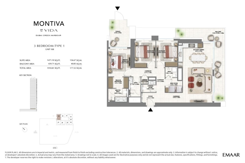 The floor plan of Montiva by Vida by Emaar Properties is designed to suit various homeowners’ lifestyle needs. The 1-bedroom apartment ranges between 755 sq. ft. and 1,261 sq. ft. The 2-bedroom apartment’s size is from 1,143 sq. ft. to 1,758 sq. ft. and the 3-bedroom unit is bigger ranging between 1,835 sq. ft. and 1,911 sq. ft. Each unit comprises modern kitchens with state-of-the-art fixtures and fittings, en-suite bathrooms, and expansive living areas.