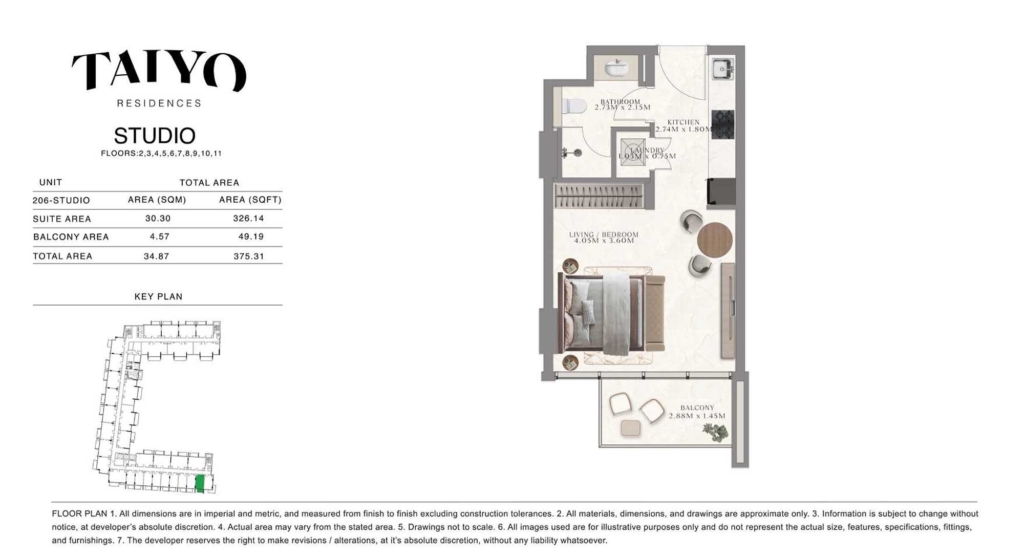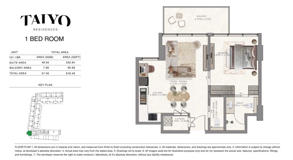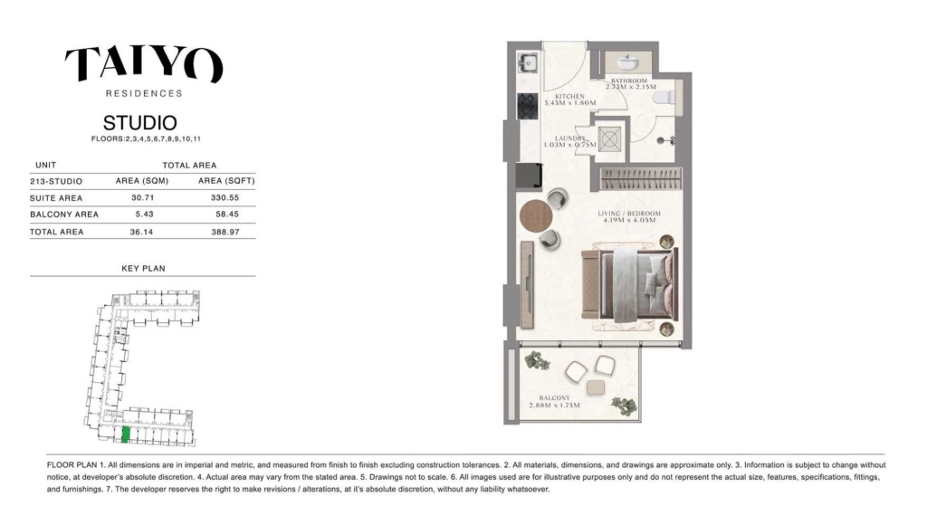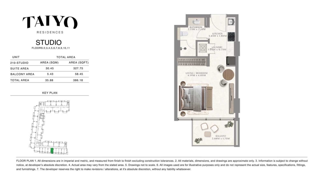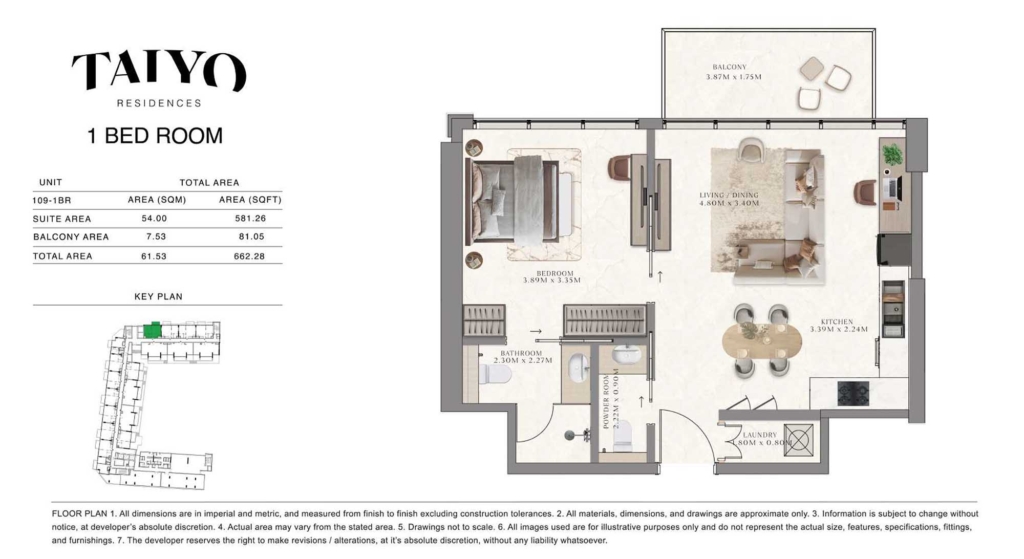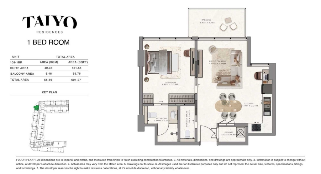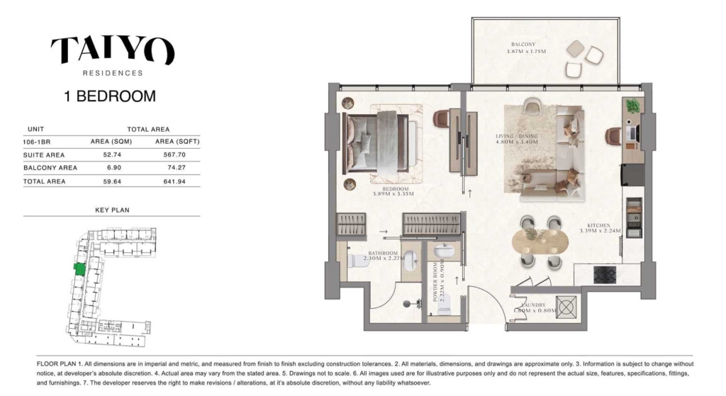 Taiyo Residences is located in the bustling region of Wasl Gate, one of Dubai’s most exciting urban areas. Its location was designed to give residents ease of access to transport and essential services throughout Dubai. It offers excellent connectivity, positioned just moments away from Sheikh Zayed Road (E11), one of Dubai’s primary thoroughfares.