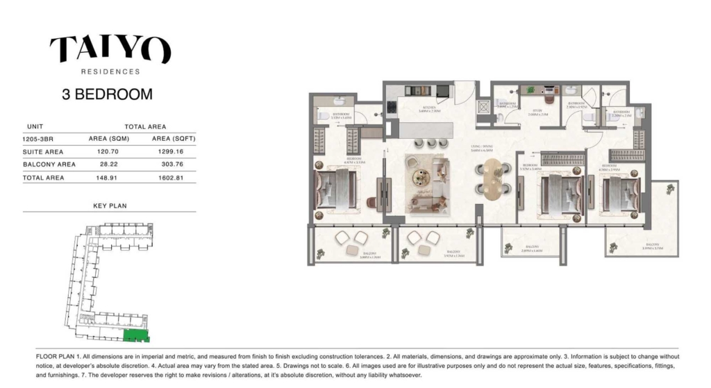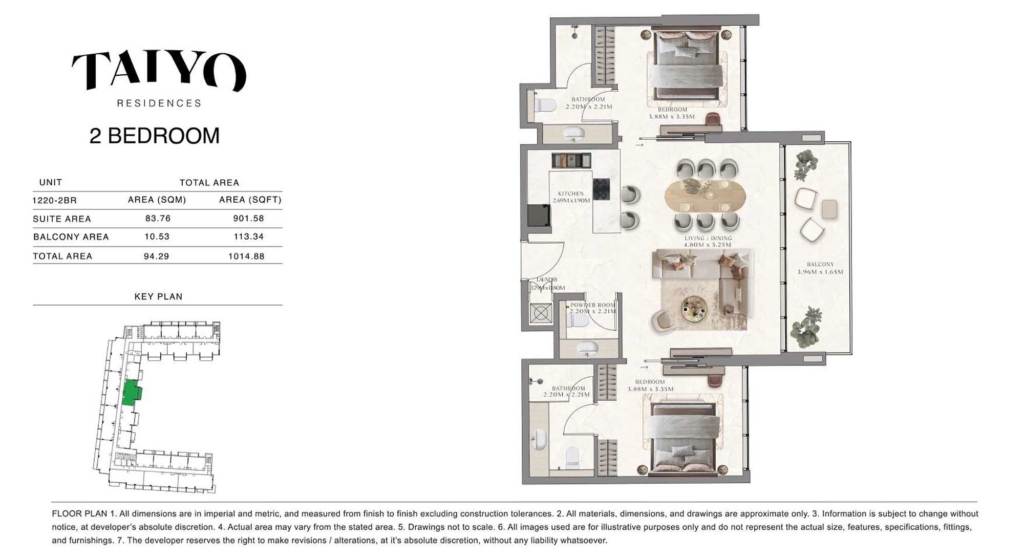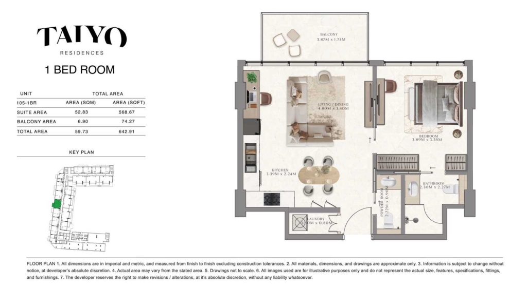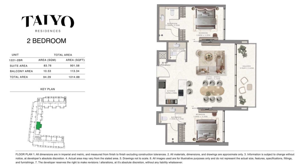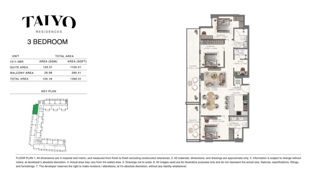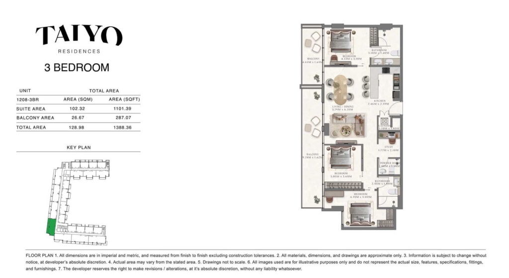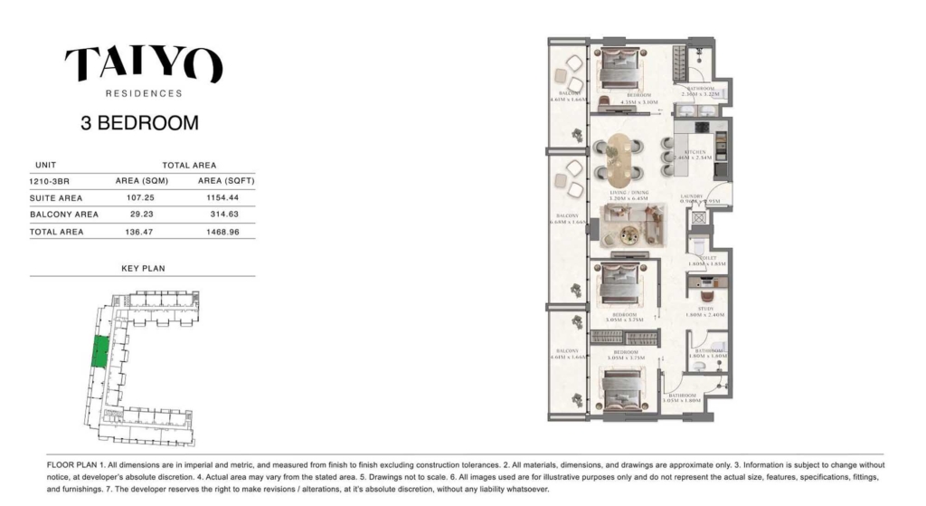 Taiyo Residences offers a captivating selection of floor plans, from cozy studios to spacious three-bedroom apartments with maid accommodations. Each unit features expansive living areas and stylish modern kitchens, complemented by luxurious bathrooms for a truly refined lifestyle. The living space has adjacent dining areas perfectly blended into it, ideal for having intimate dinners or large parties.