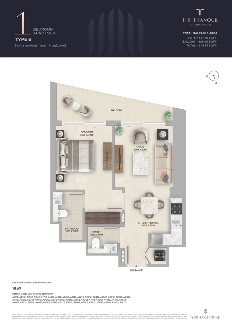 The floor plans at The Tranquil are designed to maximize space, light, and efficiency. This development offers a variety of one- and two-bedroom units, each featuring unique details. From the smaller one-bedroom units to the more spacious two-bedroom homes, all residences are thoughtfully designed. The living rooms are roomy, the kitchens are well-equipped, and the bedrooms are cozy. Many units also include balconies that provide views of the skyline, greenery, or the surrounding roads.