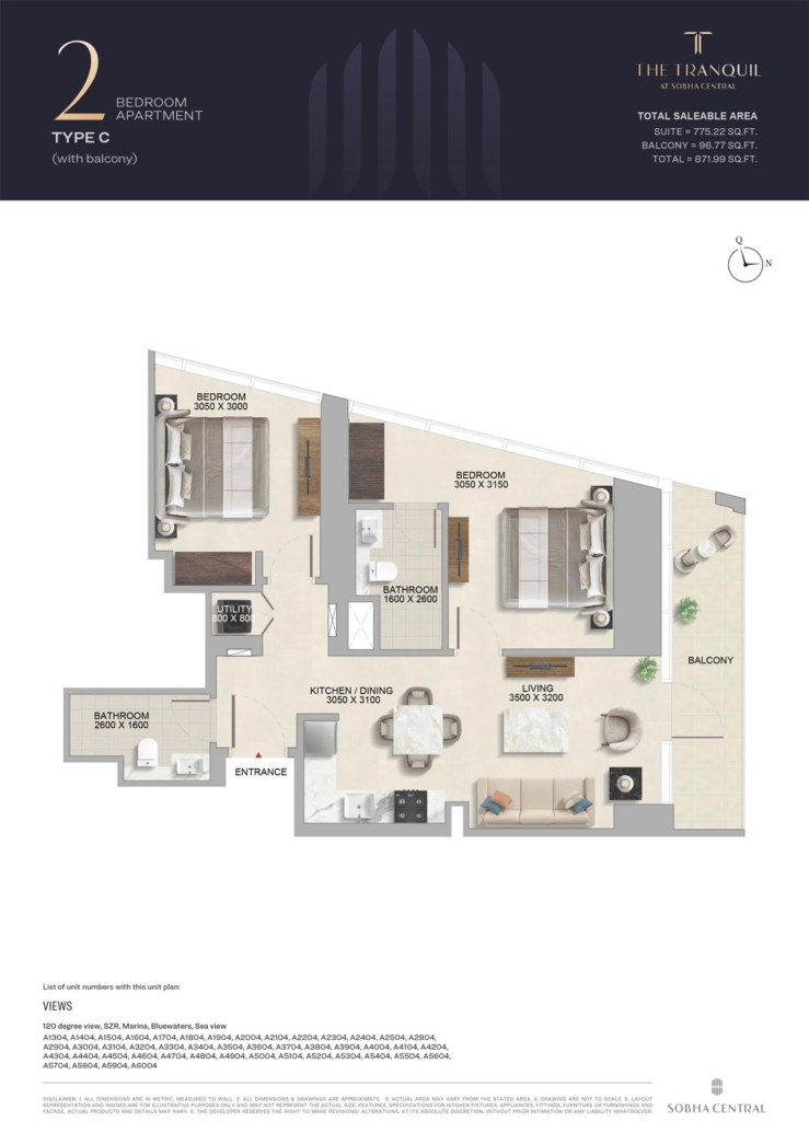 The sizes of the units start at approximately 495 sq. ft. for the one-bedroom options, while the two-bedroom homes increase in size to 871 sq. ft. These options cater to a range of lifestyles in this beautiful location in Dubai.